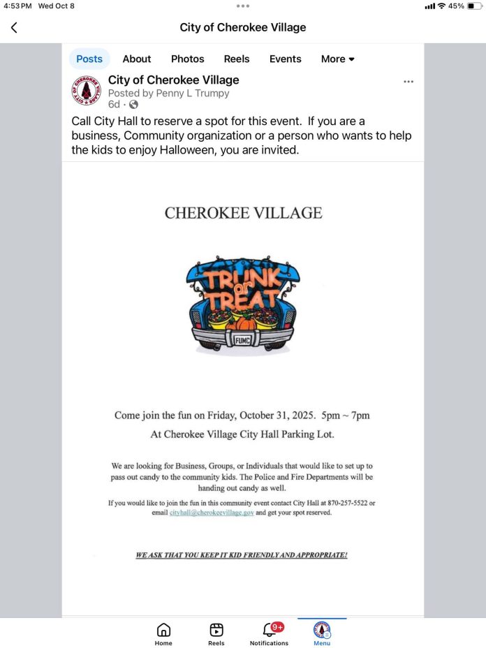 Anyone interested in reserving a spot can register through Cherokee Village City Hall. Organizers remind participants to keep decorations and costumes kid-friendly and appropriate for all ages.