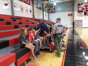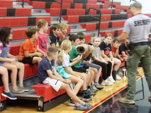 After the bite suit demonstration, School Resource Officer Jeremy McKee put on a bite sleeve and “played” with Karo in the gym. Deputy Sherman explained that, for Karo, the bite suit and bite sleeve are like fun games. The event ended with Deputy Sherman and Deputy Lane answering questions from the fourth-grade students.