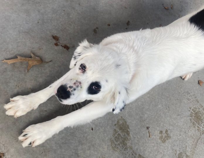 Meet Gnomie! A colorful 2-year-old, white and black blend of Australian Shepard & Blue Heeler who is waiting for you at The Humane Society of North Central Arkansas.