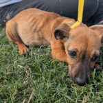 This sweet little pup was found in Rover, Missouri by Ozarks Pet Rescue. Her name is Little Foot, and she is an estimated, 6-8 week Black Mouth cur. She is currently malnourished and full of ticks, fleas, and parasites and one foot is folding over due to lack of muscle and nutrition.
