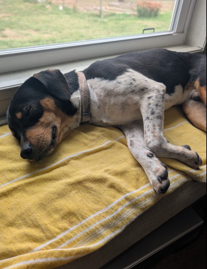He exhibits great behavior on and off the leash, is housebroken, and great with other people and other dogs. Also; If you like snuggling, he is your guy!