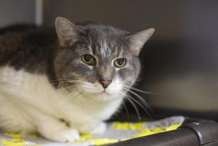 Meet Sarah! A 7-year old, Gray & White Domestic Medium Hair, available for adoption through The Humane Society of North Central Arkansas.