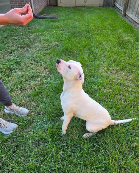 Whitney showed up to her current owners as a stray. In their care; she was spayed, neutered, vaccinated, and found to be heartworm negative. The current owners note she also has high Pray Drive (nose to nose with cats with no issues but never loose with cats) When found, she had bleeding skin and bad flea bites.