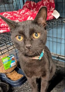 George (black in color) is an almost 3-year old male. He is said to be friendly with people of all ages, is playful with dogs, and has been an indoor/outdoor cat. He does use the litterbox when he is indoors.