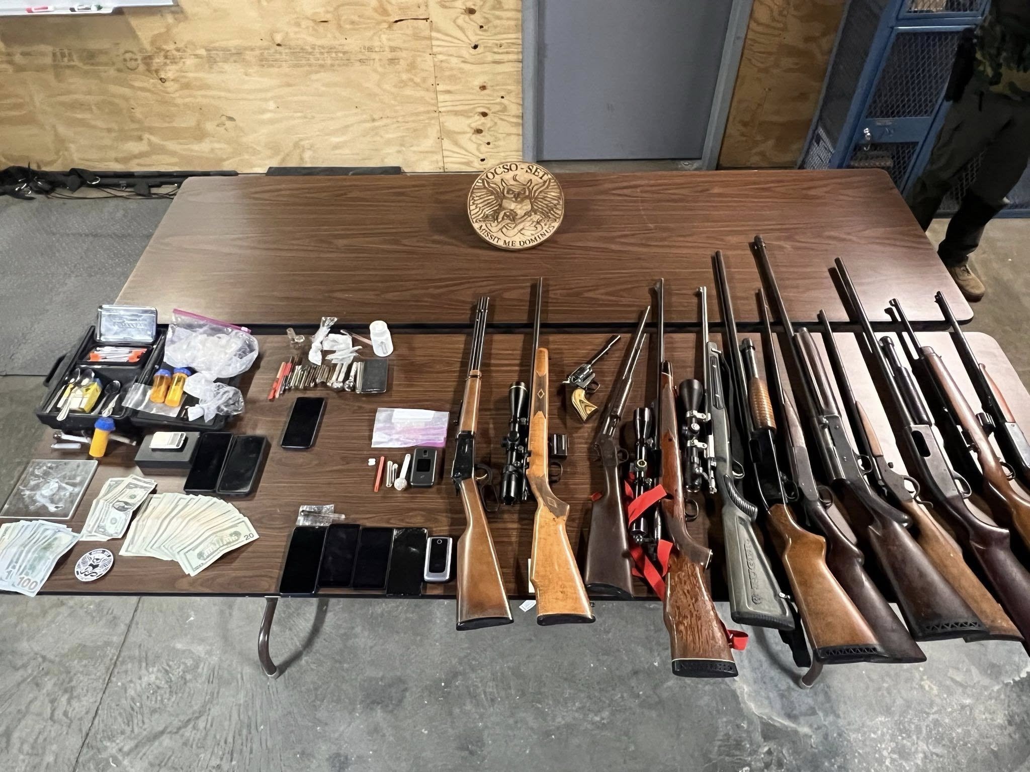 According to an official statement, Ozark County Deputies obtained a search warrant for two adjoining properties in Bakersfield after an extended investigation into reports of suspicious behavior. On January 8, 2025, law enforcement executed the warrant, uncovering approximately one pound of illegal narcotics, 13 firearms, a substantial amount of cash, drug paraphernalia, and evidence indicative of large-scale narcotics trafficking.