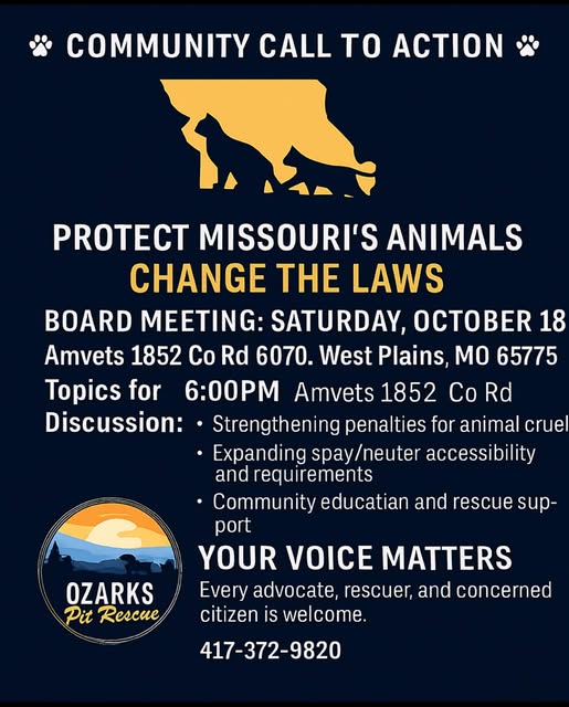 At 6pm will be the first meeting to help fight to change spay and neuter laws and to Strengthen Animal Cruelty laws in Missouri. Amvets 1852 County Road 6070 West Plains, Mo 65775.
