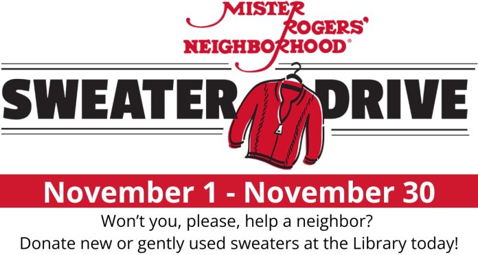 The Baxter County Library is one of many libraries across Arkansas participating in this year’s statewide Mister Rogers’ Neighborhood Sweater Drive.  During the Neighborhood Sweater Drive, members of the community are asked to donate new or gently worn sweaters, as well as other cold-weather clothing, at the Library, 300 Library Hill Ln, Mountain Home, AR 72653. Sweaters collected in this drive will be distributed by The Salvation Army.