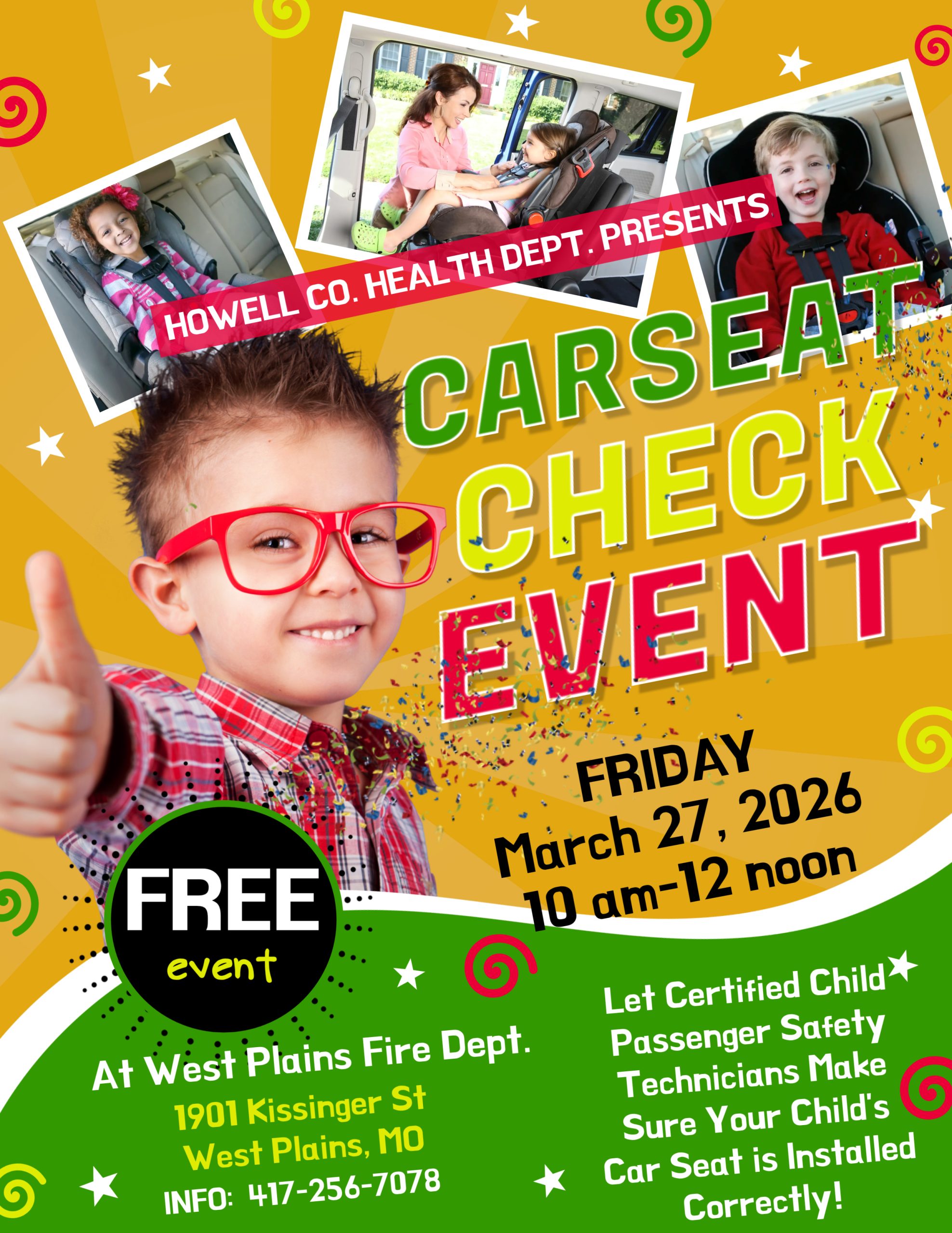 The Howell County Health Department will host a free car seat safety check on Friday, March 27, from 10 a.m. to noon at the West Plains Fire Department, located at 1901 Kissinger Street.