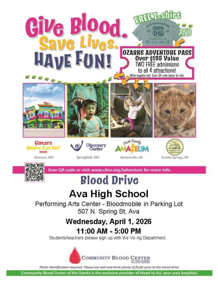 Ava, MO. – Community Blood Center of the Ozarks, the sole provider of blood and platelettes to area hospitals, will be hosting a blood drive in Ava April 1st.