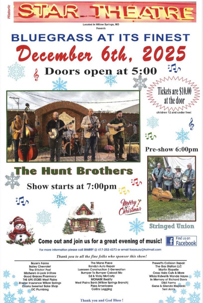 Willow Springs, MO. – Those looking for a chance to celebrate the coming Christmas season with a bluegrass flare will find the perfect show for them coming up on Saturday, December 6th in Willow Springs.