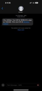 It claims your bill is due (e.g., “$288.34 is due on 11/21/25”). See attached photo.