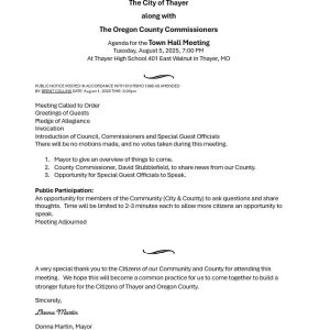 Local News City of Thayer to Hold a Town Hall Meeting Tuesday Evening By James Hurtt - August 5, 2025 FacebookTwitterPinterestWhatsApp Thayer City Hall, courtesy of the City of Thayer Facebook page. The City of Thayer will hold a Town Hall Meeting at the Thayer High School tonight, August 5th at 7:00. Agenda: Advertisement ShareTweet Advertisement