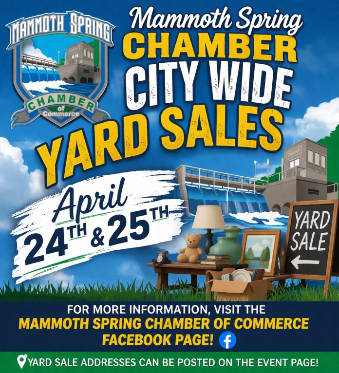 The Mammoth Spring citywide yard sale will take place April 24th and 25th, with the Chamber of Commerce keeping a map of addresses that have been registered.