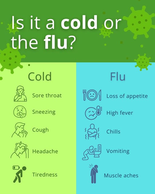 A cold often comes on gradually and may include a runny or stuffy nose, sore throat, sneezing, and mild fatigue. The flu tends to hit suddenly and can cause fever, chills, body aches, headache, extreme tiredness, and a dry cough.