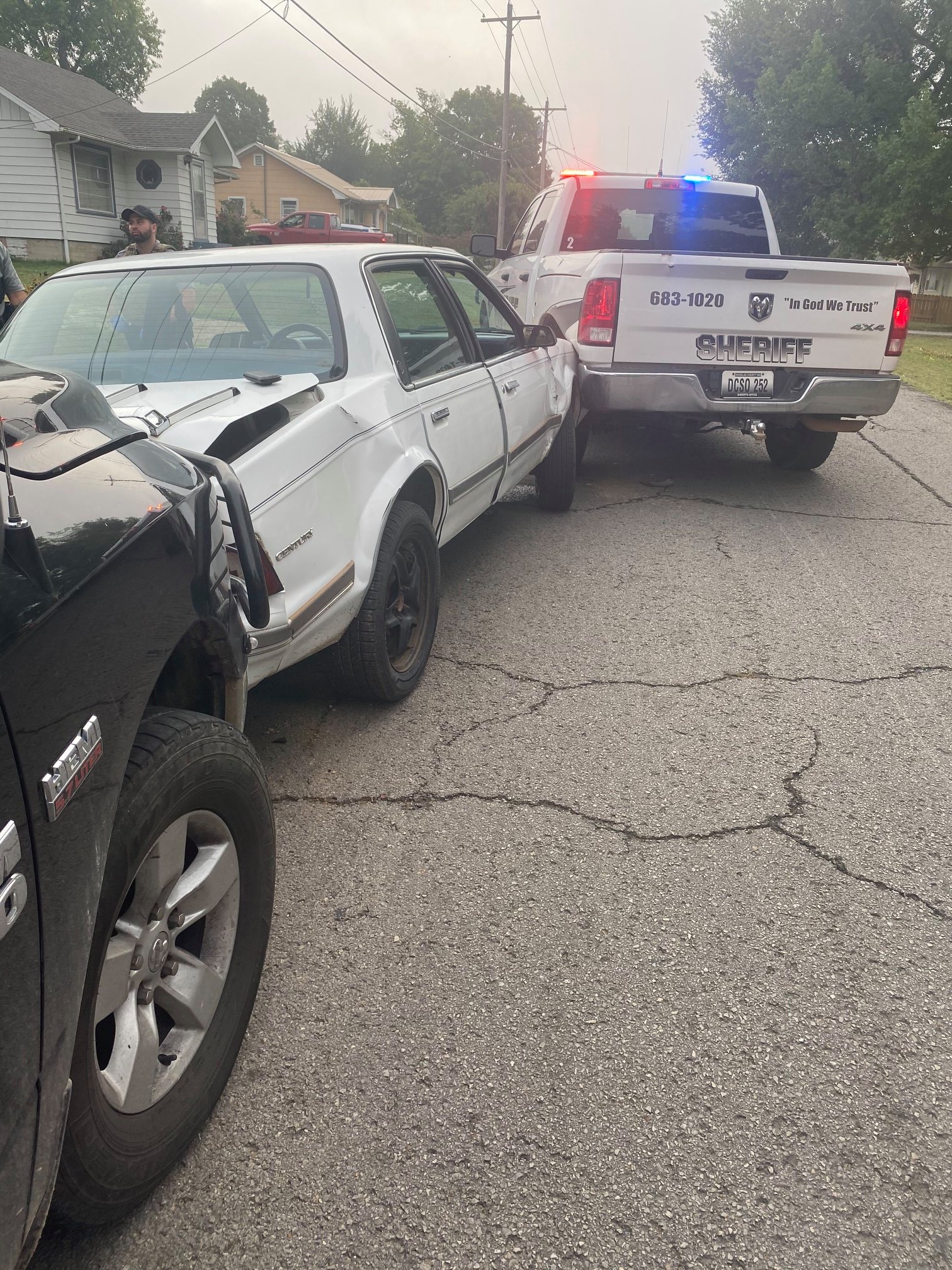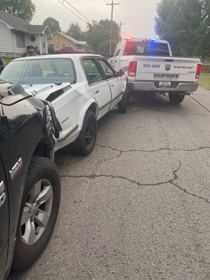 Sheriff Degase followed the vehicle and let it get past the school as kids were just starting to be dropped off for school. The vehicle pulled into North Casey’s where Sheriff Degase and Deputies Michael Schupbach and James Nelson attempted to pin the vehicle in to avoid a pursuit in the school area. The vehicle accelerated rapidly in the parking lot onto Bacorn Street where Deputies were able to pull in front and block the vehicle. The vehicle began to backup to go around the deputies when Sheriff Degase chose to end the pursuit to avoid placing the motoring public and the children around the school in harm, by ramming the back of the suspect vehicle pinning it between the patrol vehicles.