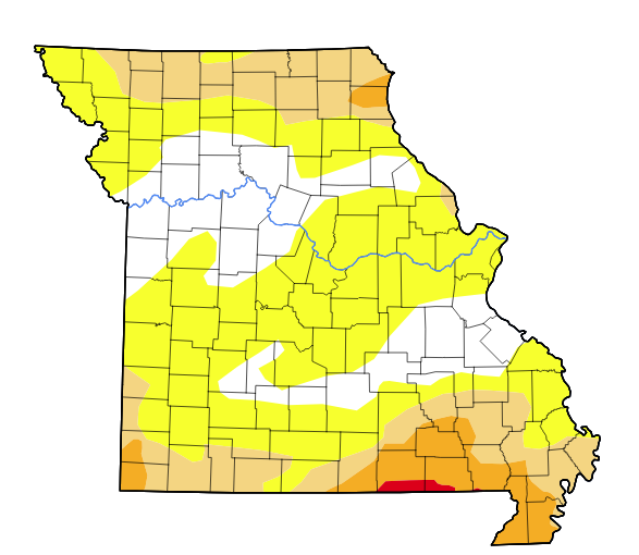 In Missouri, recent rains have helped to alleviate drought conditions, with sections of Texas and Wright Counties now considered outside of drought conditions. However, the further south you go, conditions quickly worsen. On the scale of D0 to D4, up to D3 is present in Small portions of Howell, Oregon, and Ripley Counties.