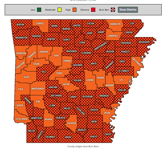 Additionally, the burn ban list for Arkansas has now swelled up to being roughly 2/3 of the counties in the state, with now the entire state being listed as being in the “high fire risk” range.