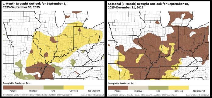 D3 (extreme) drought conditions have swept into the Bootheel and northeastern Arkansas, which means D2 (severe) drought conditions have spread further into the listening area. This excludes a portion of eastern Texas County and western Shannon County, where incoming rainfall has eased concerns somewhat.