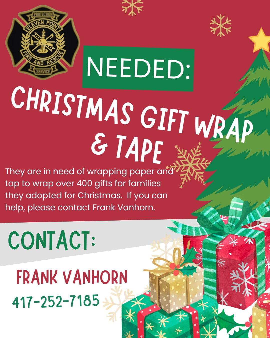 Willow Springs, MO. – The Eleven Point Fire Department in Willow Springs is asking for the public to help provide to local kids for Christmas by donating toys or wrapping paper to their department.