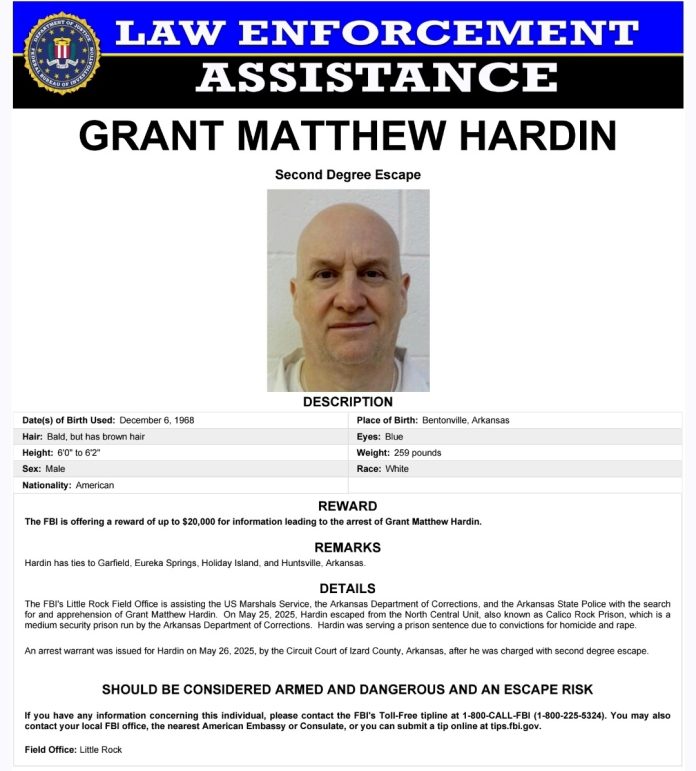 According to multiple sources the search for escaped convict Grant Hardin has ended.  It is reported that he was taken into custody this afternoon by the Izard County Sherriff’s Department near the corrections facility. We will update the story once more information is available.