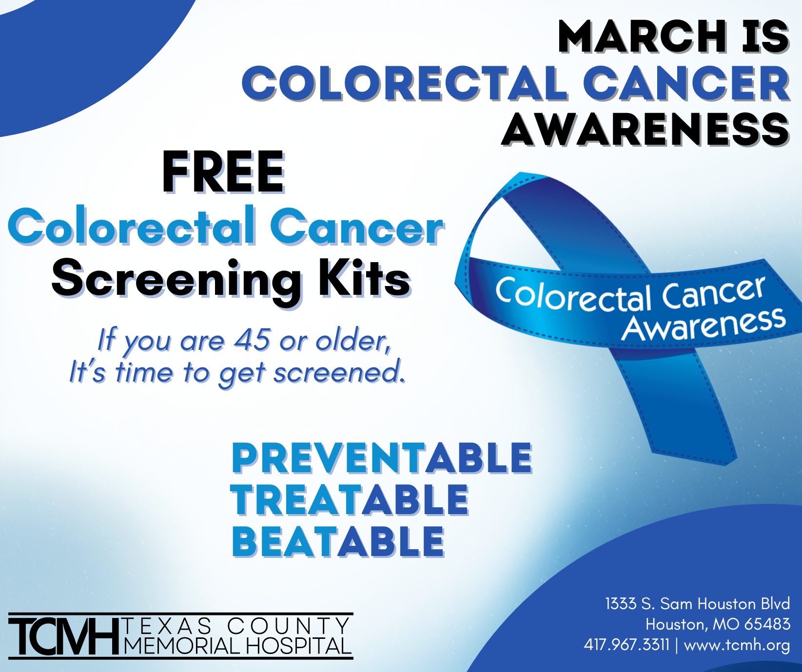 The American Cancer Society designates March as Colorectal Cancer Awareness Month. In observance, Texas County Memorial Hospital (TCMH) is offering free colorectal cancer screening kits to area residents.