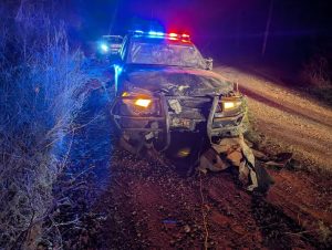 One of the vehicles continued eastbound on U.S. Highway 160, while the second vehicle turned onto County Road 7140 and fled. Deputy Taylor pursued the vehicle on County Road 7140. While attempting to cross a low-water slab during the pursuit, Deputy Taylor lost control of his patrol vehicle. The patrol vehicle entered a ditch and struck multiple trees before coming to rest. The fleeing vehicle continued and was not immediately located.