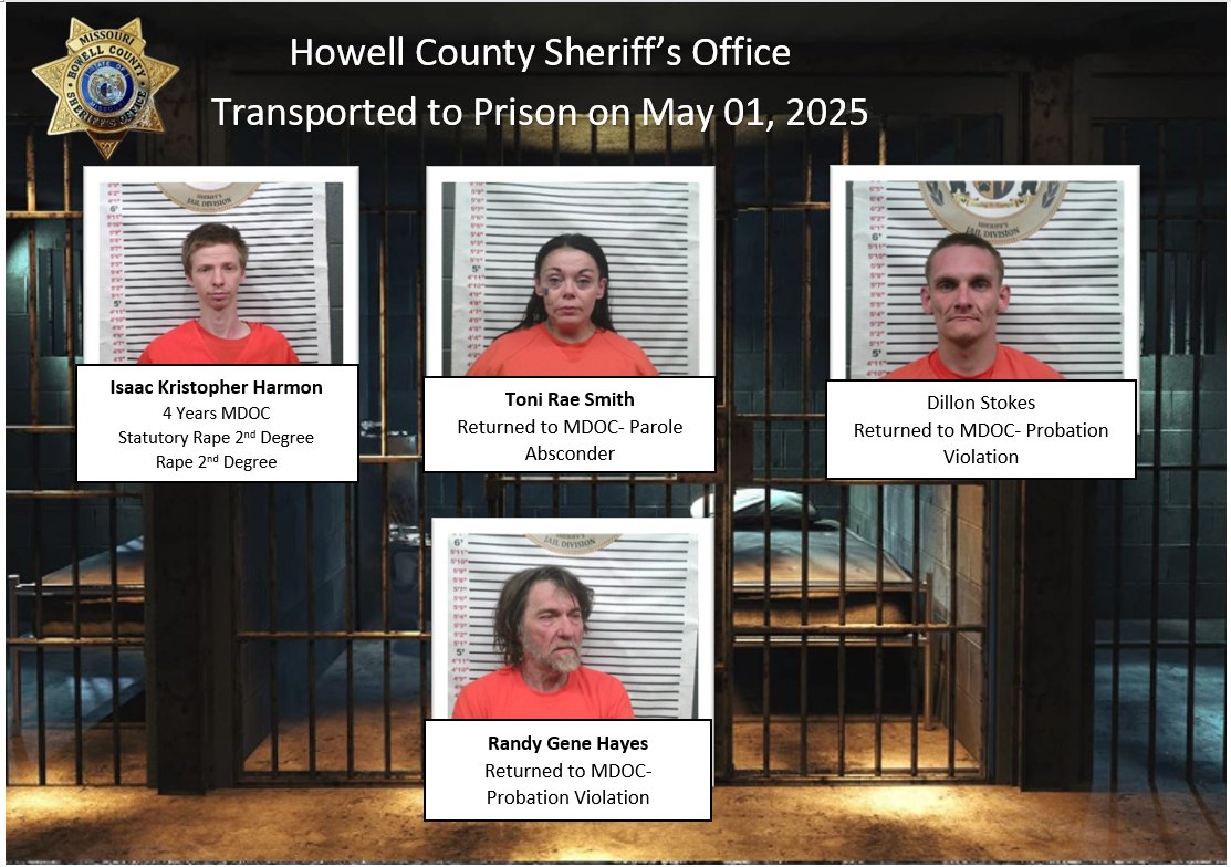 On Thursday May 01, 2025 the following inmates were transported from the Howell County Sheriff’s Office to the following Missouri Department of Corrections facilities: