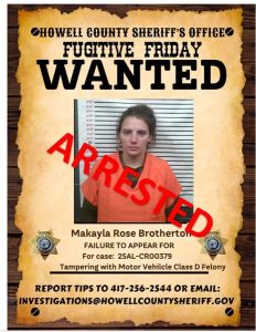 Fugitive Friday Makayla Rose Brotherton was arrested by the Fugitive Task Force Team and the Howell County Sheriff’s Office today for her warrant for Failure to Appear for Case 25AL-CR00379 for the Class D Felony of Tampering with a Motor Vehicle.