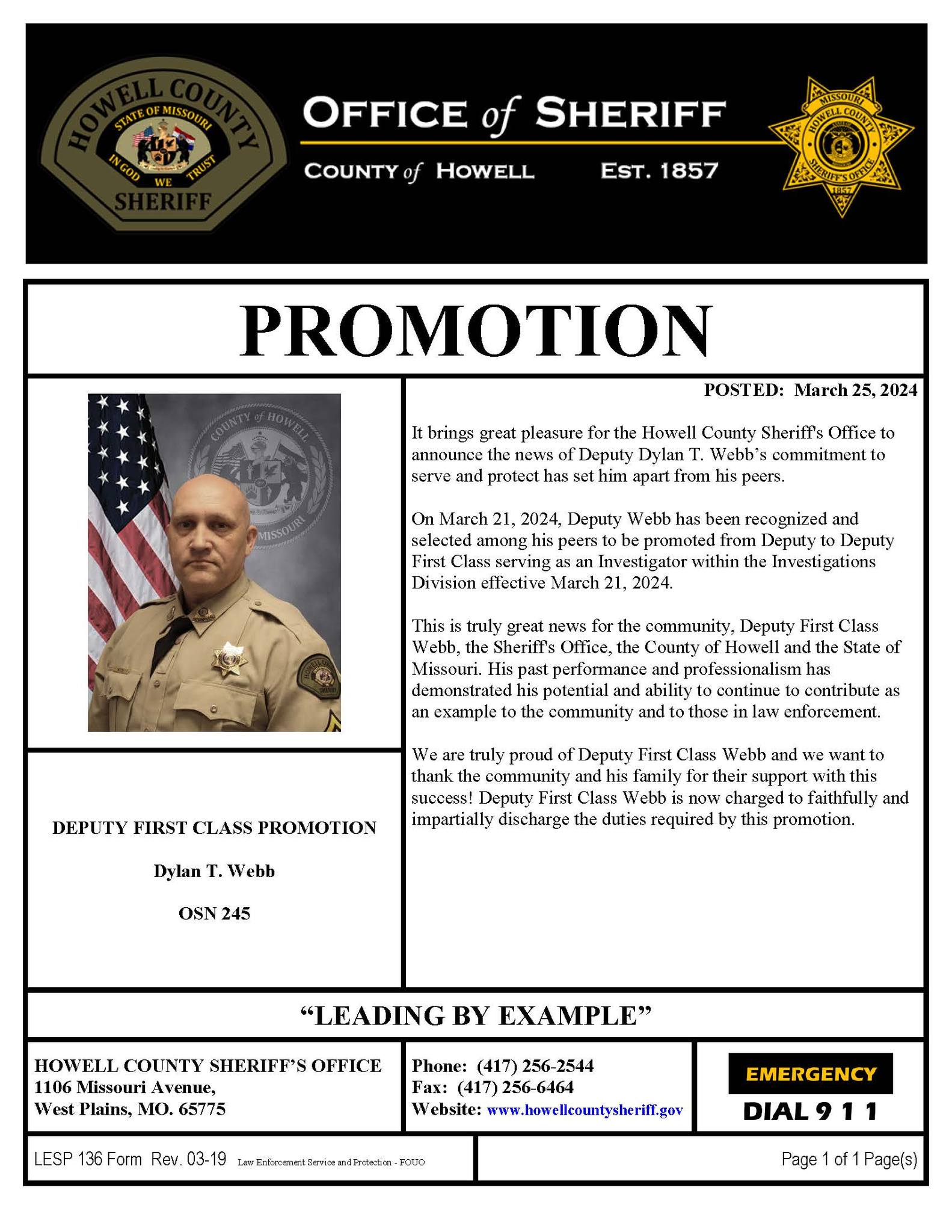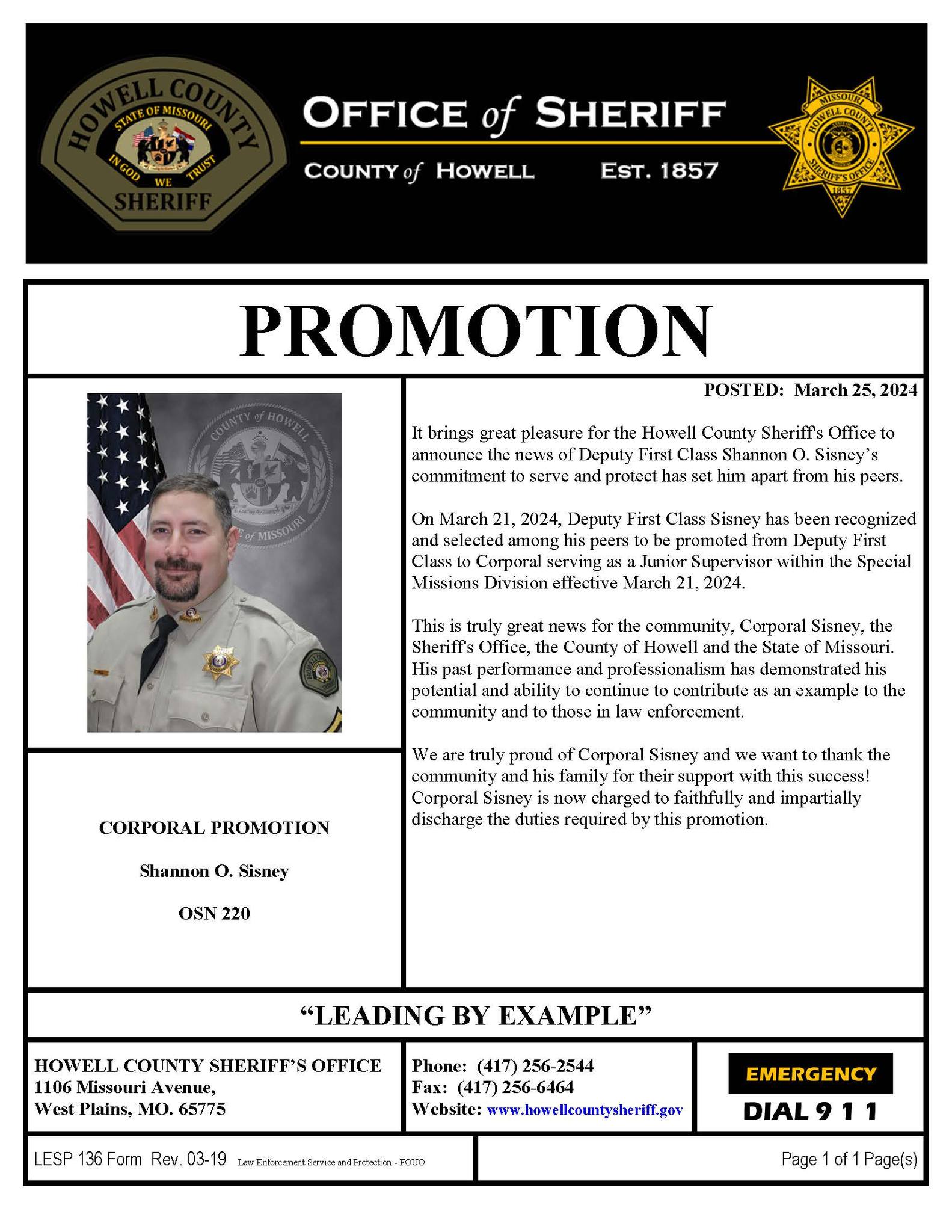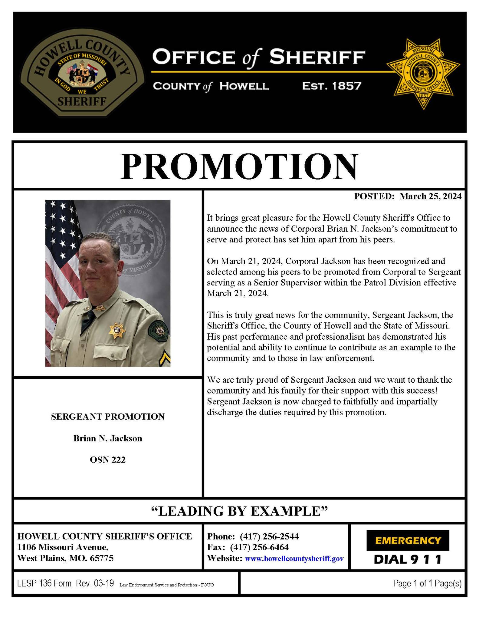 Howell County, MO. – Recently the Howell County Sheriff’s Office promoted six different individuals within their ranks. All the following promotions were put into effect on March 21, 2024.