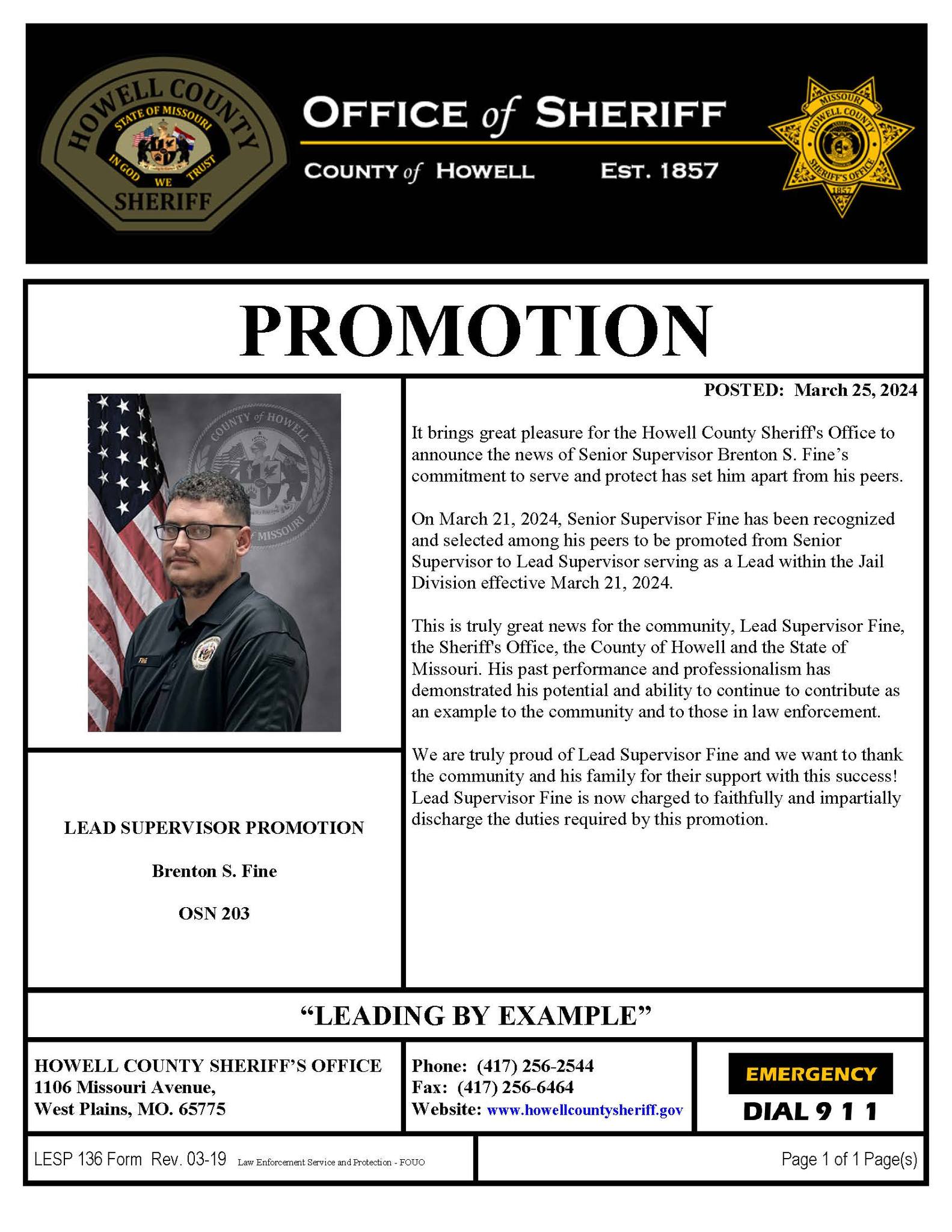 Senior Supervisor Brenton S. Fine was promoted to Lead Supervisor to serve as a Lead within the Jail Division.