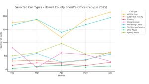 • In June, the Howell County Sheriff’s Office experienced a notable increase in total calls for service, with 1,274 incidents, the highest monthly total over the past five months.