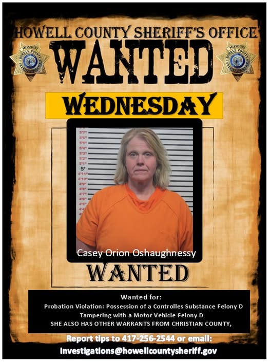 Today’s Wanted Wednesday from the Howell County Sheriff’s Department is 42 year old Casey Orion Oshaughnessy. Her warrants are for a failure to appear for: Original Case: 19AL-CR01012-01, Class D Felony for tampering with a motor vehicle and for failure to appear for Possession of a Controlled Substance. She also has warrants from other counties, she has been a fugitive since 2023.