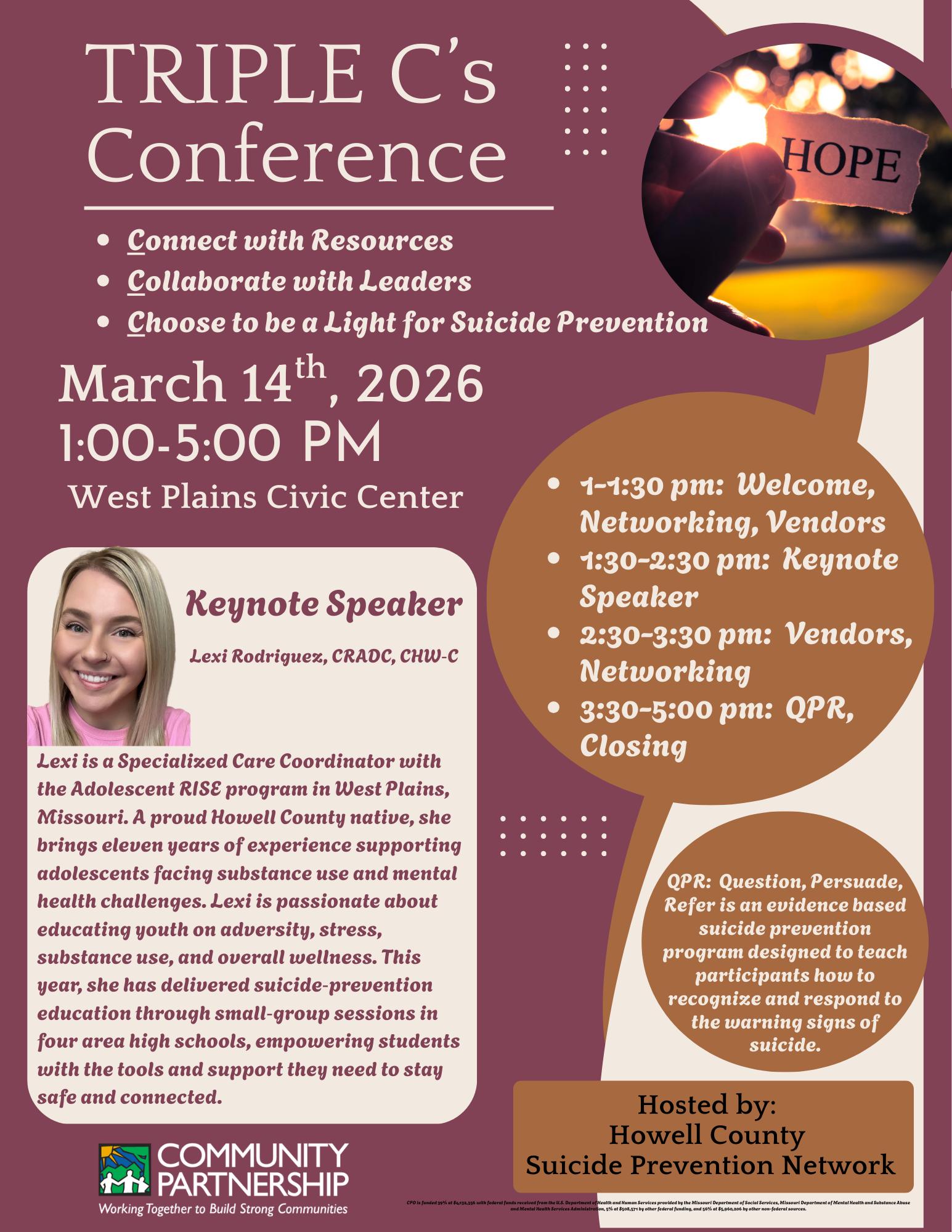 The Howell County Suicide Prevention Network will host its annual TRIPLE C’s Conference on March 14, 2026, bringing community members together for an afternoon focused on suicide‑prevention education and local resource awareness. The event runs from 1 to 5 p.m. at the West Plains Civic Center.