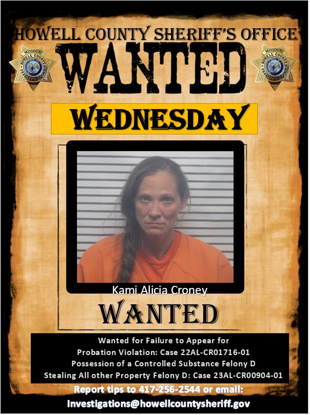 If you recognize fugitive Kami Croney, and have information that could lead to her arrest, please contact the Howell County Sheriff’s Office at 417-256-2544.