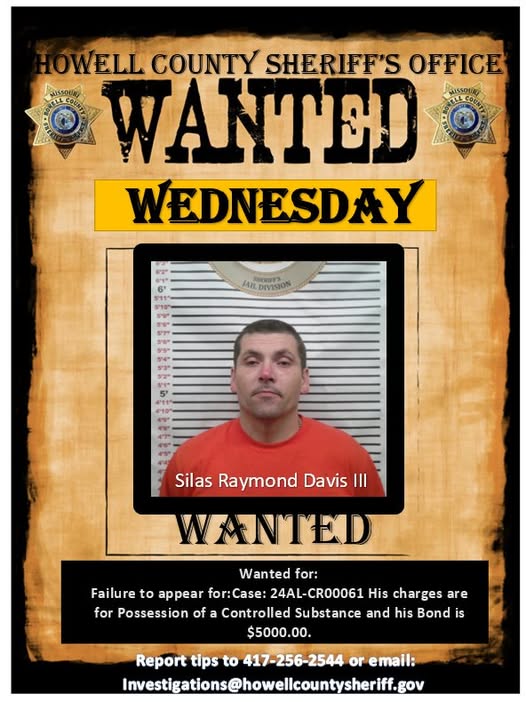 Today’s Wanted Wednesday is 39 year old Silas Raymond Davis III. His warrant is for a failure to appear for: Case: 24AL-CR00061 His charge is for Possession of a Controlled Substance and his Bond is $5000.00. He has been known to live in Summersville, Mountain View, Ava and Springfield, MO.