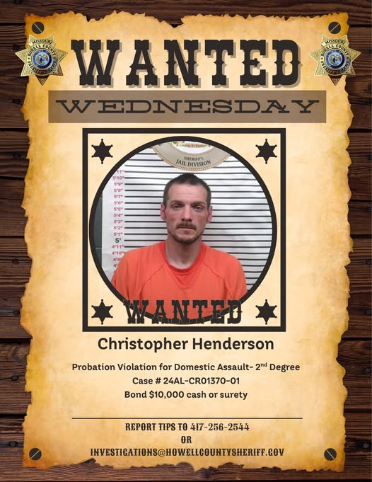 If you recognize Christopher Henderson or have information that could lead to his arrest, please contact the Howell County Sheriff’s Office at 417-256-2544.