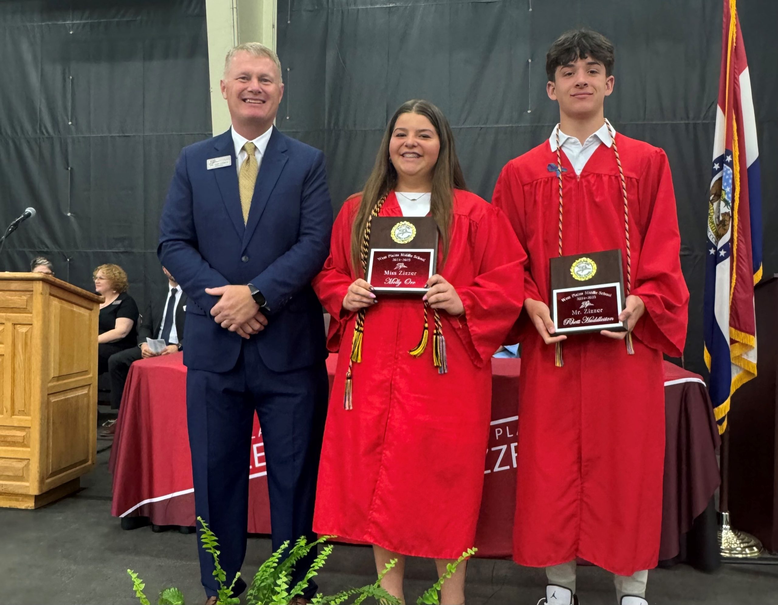 During the West Plains Middle School 8th Grade Promotion Ceremony held this evening, Rhett Huddleston and Molly Orr were named Mr. and Miss Zizzer—an honor reserved for students who truly embody the spirit of a Zizzer. The distinction celebrates outstanding leadership, academic excellence, and positive engagement both in and out of the classroom. Huddleston and Orr were recognized for their exemplary citizenship, strong academic performance, and active participation in school activities.