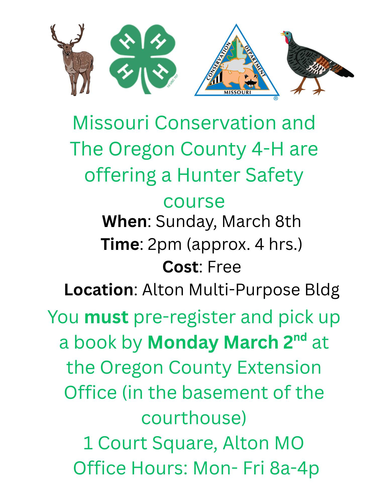 Those wishing to participate must register in person at the Extension Office, where they will also pick up the official Hunter Education book needed for the course. Registration is open now and will close on Monday, March 2.