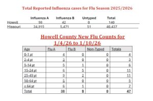 Howell County Influenza Report for the Week of Jan. 4- Jan. 10, 2026. Seasonal Influenza activity in Missouri remains very high. Nine influenza-associated deaths have been reported to-date statewide this flu season.
