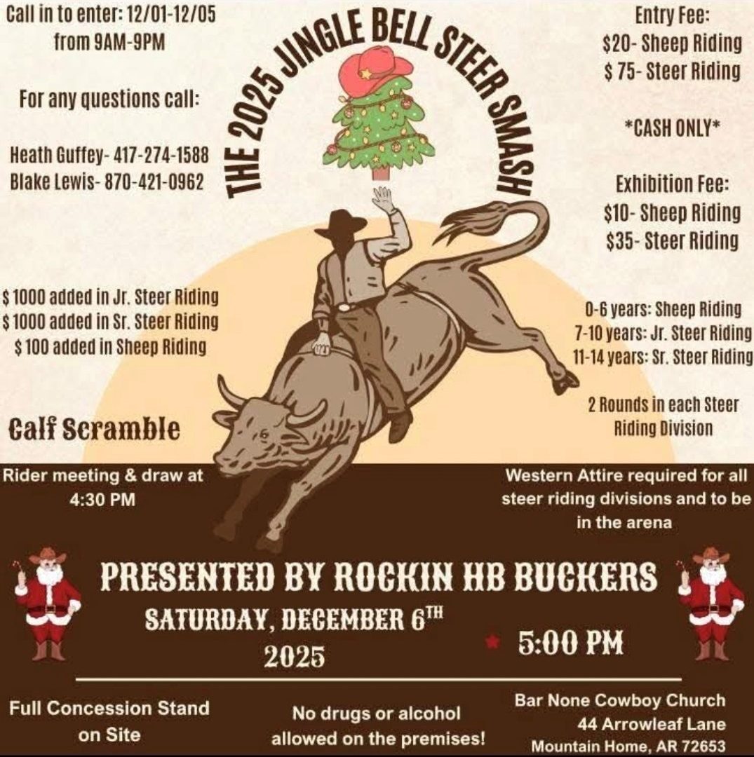 This event is called the Jingle Bell Steer Smash, which will happen on Saturday, december 6th at 5pm. The location will be 44 Arrowleaf Lane, Mountain Home.