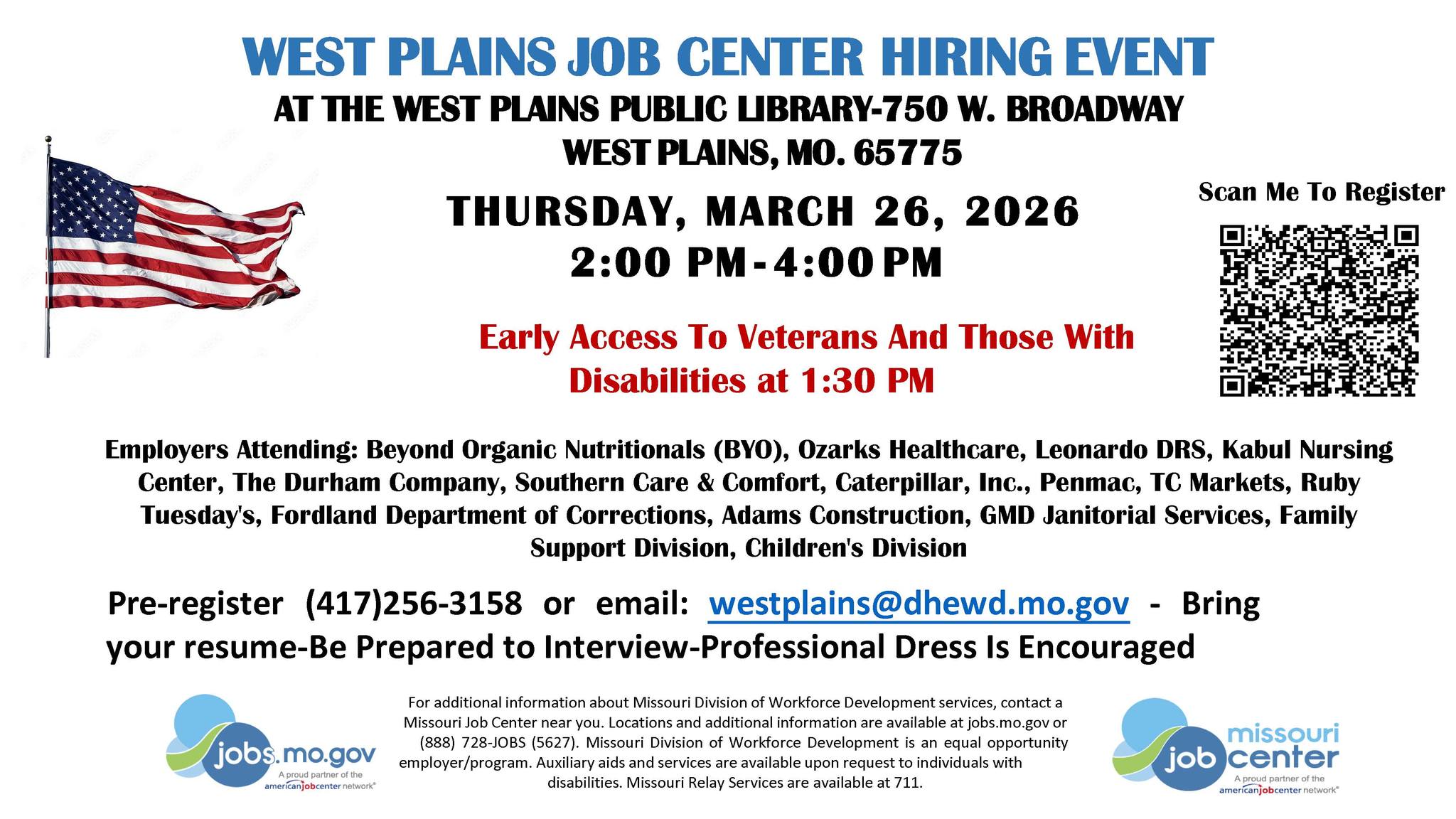 This hiring event will take place at the West Plains Public Library, 750 Broadway. Timing is 2pm to 4pm. Attendees are asked to have their resume ready and present. At least 15 different local employers will be present.