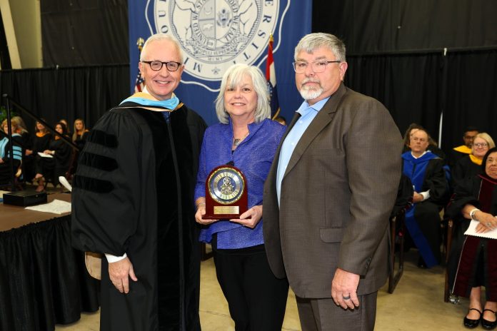 WEST PLAINS, Mo. – In the spirit of those who established Missouri State University-West Plains (MSU-WP) over 60 years ago, campus officials presented John and Dixie Williams, West Plains, with the prestigious Granvil Vaughan Founder’s Award during Saturday’s commencement ceremony at the West Plains Civic Center.