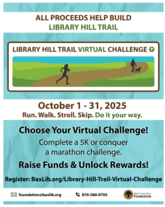 MOUNTAIN HOME, AR – Lace up your sneakers, grab a friend, and hit the pavement (or the trail, or even the treadmill!) for the Library Hill Trail Virtual Challenge this October. Hosted by the Baxter County Library Foundation, this flexible, fun event invites participants to complete either a 5K or a Marathon Challenge between October 1–31, 2025—anytime, anywhere, and at your own pace.