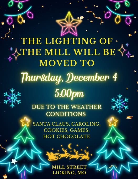 Local News Licking Lighting of the Mill Rescheduled By James Hurtt - November 29, 2025 FacebookTwitterPinterestWhatsApp The Lighting of the Mill has been moved to Thursday, December 4 at 5:00pm. Due to weather conditions. ShareTweet Advertisement