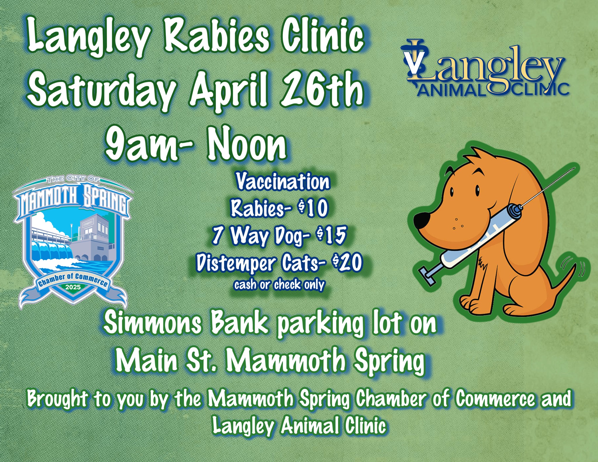 The Mammoth Spring Chamber of Commerce and the Langley Animal Clinic are holding a low-cost rabies clinic for those who wish to bring their pets by for vaccination.