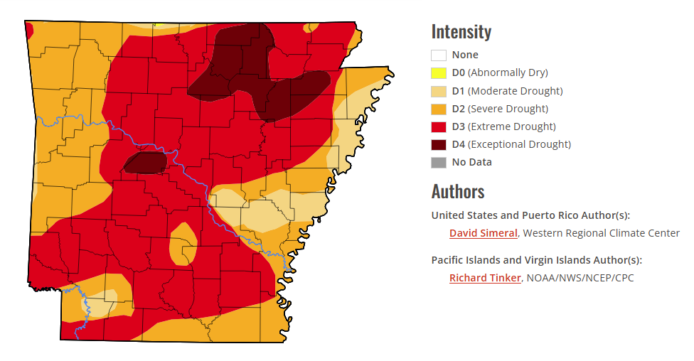The D4 “Exceptional Drought”, the maximum level of drought, range in Arkansas has expanded, with all of Sharp County, and most of Izard and Fulton Counties now being encompassed. D3 drought currently takes up most of the rest of the Arkansas range of our listening area.
