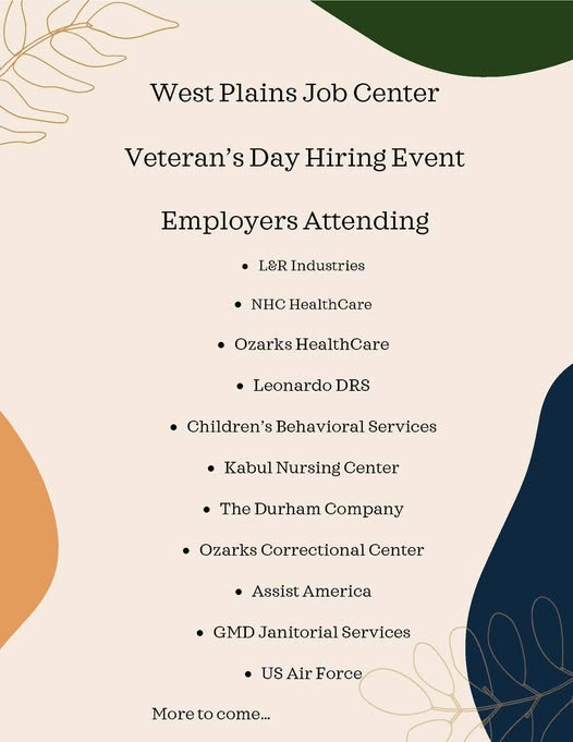 The Veteran’s Day Hiring Event will be held at the West Plains Library on November 4th, 2025, from 2pm – 4pm.