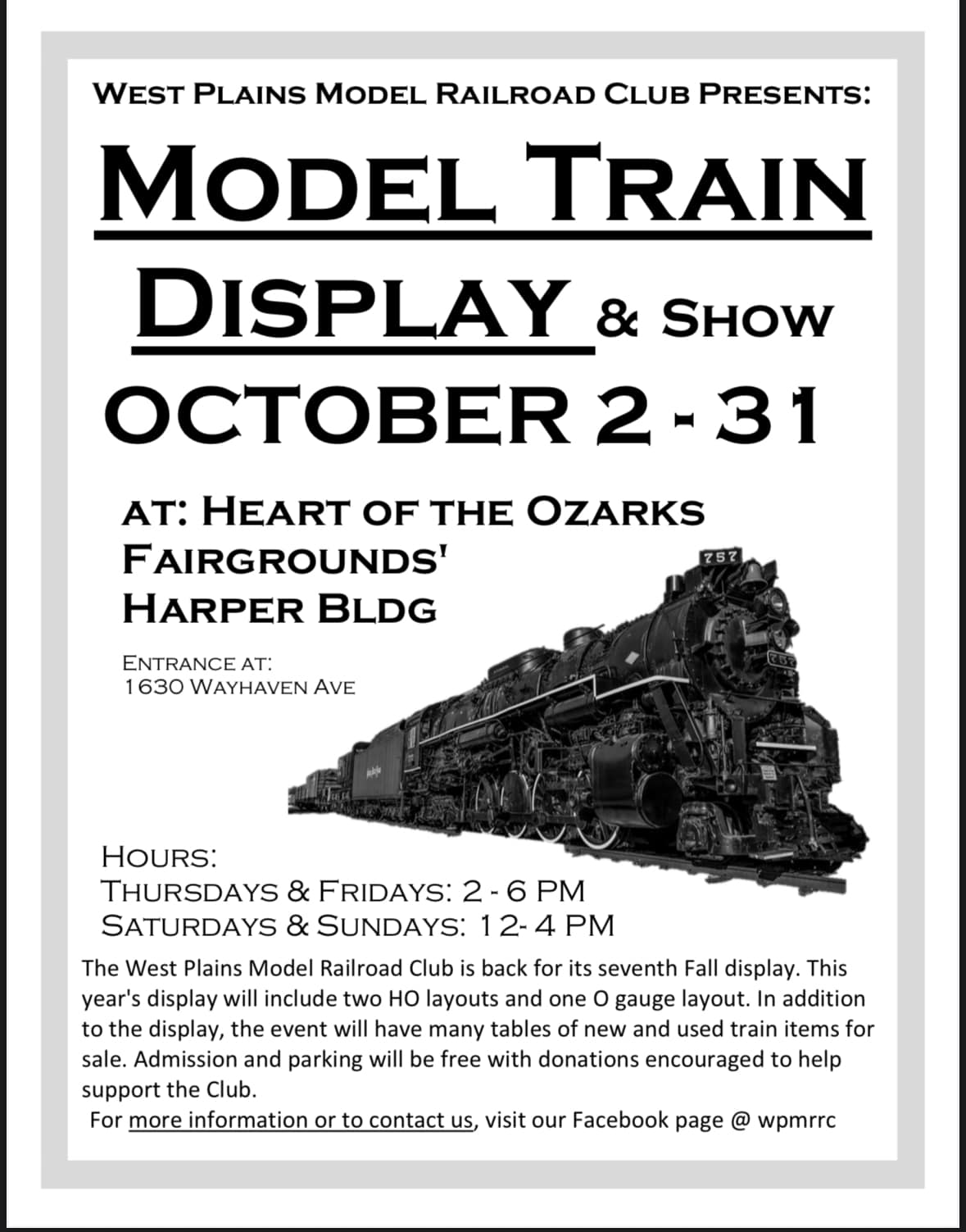 The West Plains Model Train Club will host its seventh model train exhibit at the Heart of the Ozarks Fairgrounds in West Plains from October 2nd – 31st.