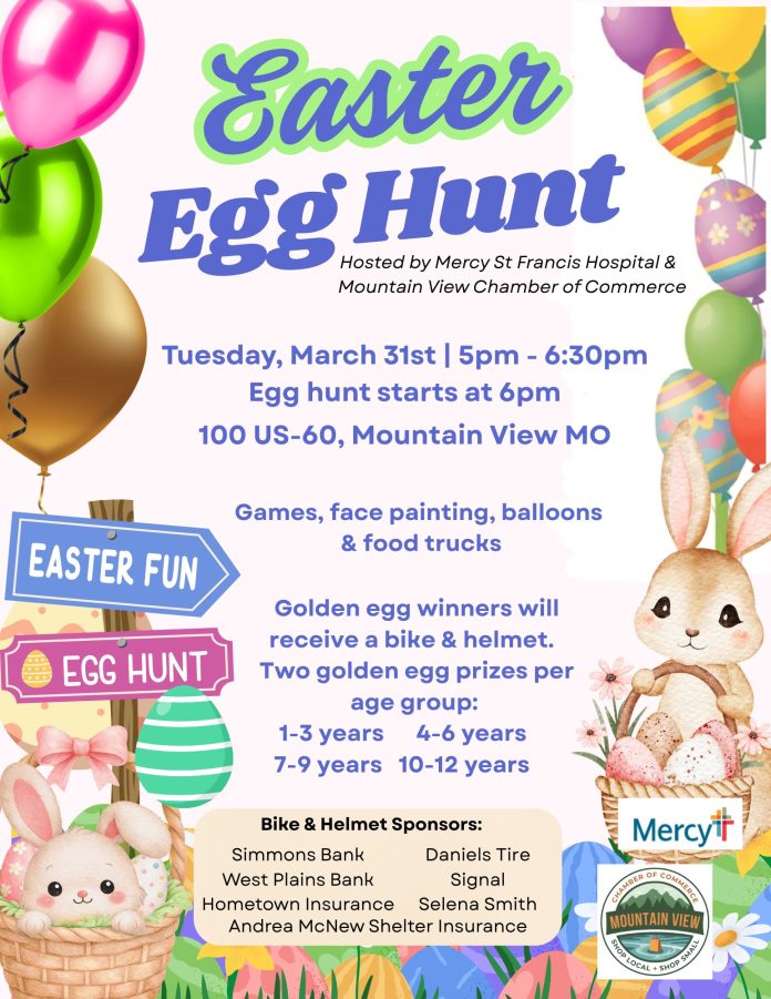 Mountain View, MO. – The annual Easter Egg Hunt, organized by the Mountain View Chamber of Commerce and Mercy St. Francis has been scheduled for March 31st.