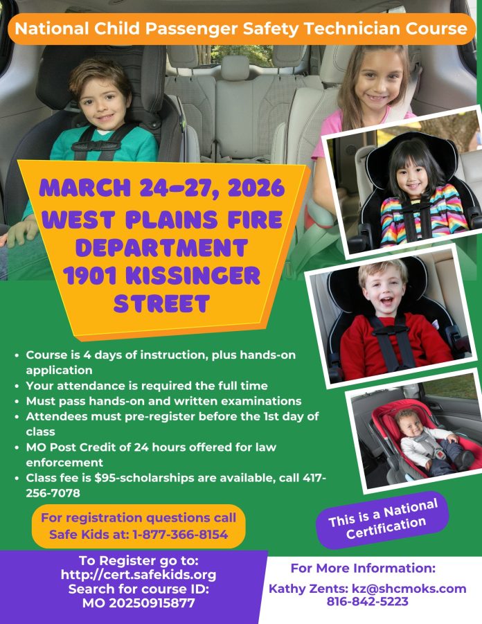 Local first responders, healthcare partners, and child‑safety advocates are inviting the public to take part in a four‑day National Child Passenger Safety Technician Course later this month. The certification training will be held March 24–27, 2026, at the West Plains Fire Department, located at 1901 Kissinger Street.